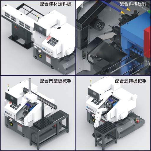 ♦送料時間短,適用於各樣支圓棒、方形 及六角長棒材,可達自動化加工,為 節省人力,生產效率最高之組合。
